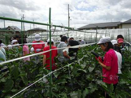 7月13日(月)に西賀茂農園で野菜の収穫を行いました。春先に植え付けたたくさんの野菜は,運営協議会の方々のご協力もあり立派に育っていました。収穫する時のコツを運営協議会の方々に教えていただきながら,賀茂ナス,万願寺とうがらしなどの京野菜を次々に収穫する子どもたち。両手で持ちきれないほどの野菜をもって「どうやって調理してもらおうかな」「こんなに持って帰ったらびっくりするだろうな」と目を輝かせていました。