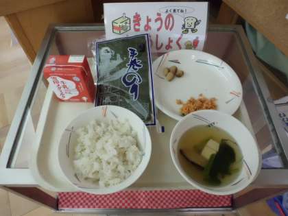 麦ご飯・牛乳・セルフおにぎり(具・梅鮭)・とら豆の甘煮・豆腐の吉野汁