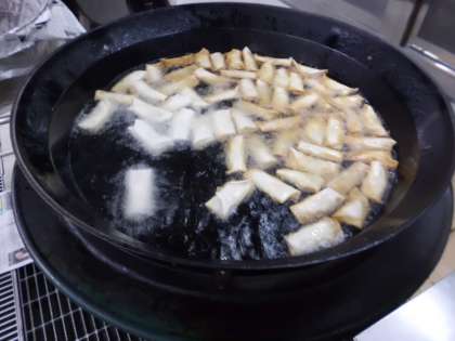 ツナ・たけのこ・春雨・干し椎茸に料理酒・オイスターソース・塩・しょうゆで味付けし,春巻きの皮で包んで油で揚げています。