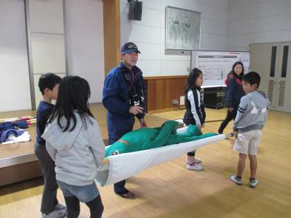 また,避難訓練後の体験活動で,4年生は担架作成訓練を行いました。