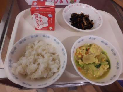 玄米ご飯・牛乳・親子煮・ひじきの煮つけ