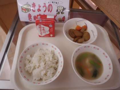 麦ご飯・牛乳・平天の煮つけ・ふわふわ団子汁