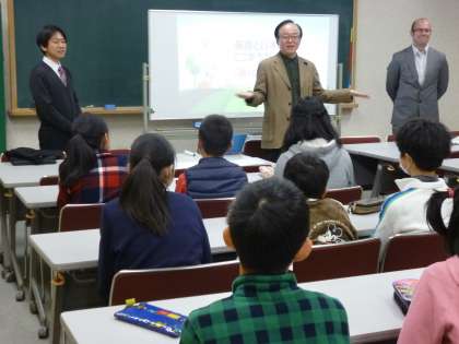 恒例になりました,京都大学の田地野先生が開発,研究されております「意味順de英語ノート」の授業が,8日(月)6年生対象に行われました。田地野先生をはじめ,3人の先生に教えていただきました。日本の文と英語の文は,鏡(逆さ)になっている話から,ユーモアを交えて,楽しくわかりやすく教えていただきました。後半,「将来就きたい職業を集めよう!」と「What do you want to be?」と,何度も交代しては,たくさんの友達にたずねていました。