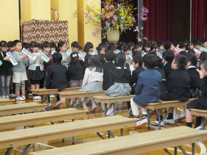 入学式では,田宮校長先生がお祝いの言葉を述べられた後,たくさんの方からのお祝いの言葉や記念品をいただきました。
