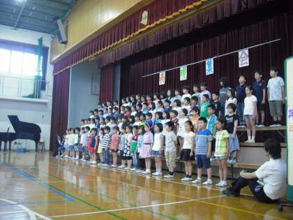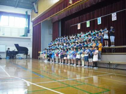 「ことば」を中心とした国語的な表現と「音楽」を中心とした音楽的な表現がありました。単に大きな声を出すのではなく,言葉や歌詞の意味を理解し,それにあった声の出し方が工夫されていました。特に高学年では,練習の過程で「どのように表現すればよいのか」といったことを子どもたちが考えることを大切に取り組みました。表現集会を通して子どもたちが,表現することのすばらしさや仲間と協力することの楽しさを感じてくれることを願っています。