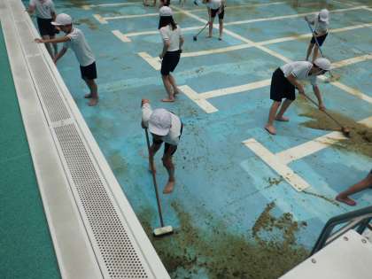 1年間使わなかったプールはとても汚れており,それをたわしやデッキブラシを使って掃除しました。プールの中だけでなく,更衣室やトイレもすっかり美しくしてくれました。これで,気持ちよく水泳学習ができそうです。放課後には,教職員でしあげをしました。