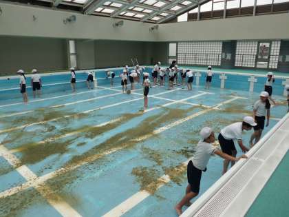 6月7日の6時間目に6年の児童がプール清掃を行いました。