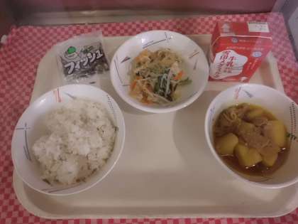 ごはん・牛乳・肉じゃが(カレー味)・もやしの煮びたし・じゃこ
