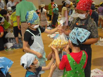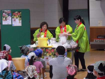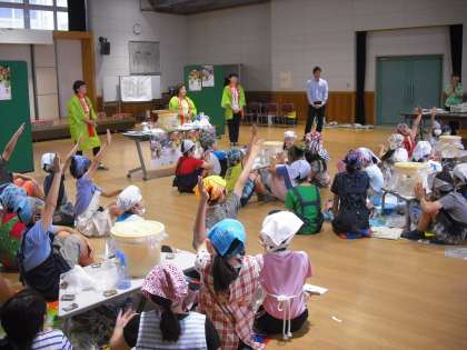 まず,梅の産地などのお話があり,その後,梅ジュースを作りを実演していただきました。試飲の時,子どもたちの中には,酸っぱいのではないかと恐る恐る・・・という子もいましたが,飲み終わった後には,「おいしい。」と暑さを吹き飛ばす味に笑顔がみられました。