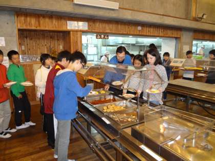 バイキングでの食事のとり方も随分と慣れ,この後の活動も考えながらバランスのよい食事をとっています。