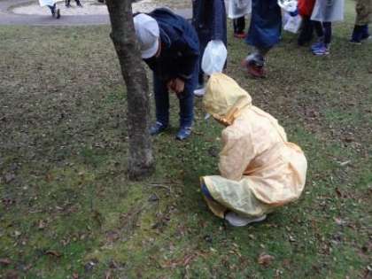 発見したきのこを子どもたちは先生に見せ,名前を聞いてみると,「おぉ!これは秋のきのこの仲間です。人の名前がついているきのこで,名前は『カワムラフウセンダケ』というきのこです。」という答えに,「わぁ!」と歓声があがっていました。