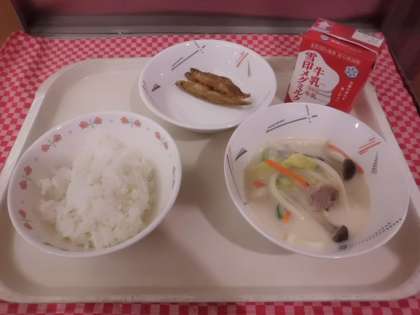 ごはん,牛乳,わかさぎのこはくあげ,豆乳鍋