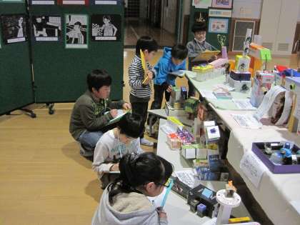 3年生は「ハッピー小もの入れ」を出展しました。身のまわりにある材料と紙粘土を使って,色々な工夫を取り入れながら,それぞれ思い描く作品に仕上げることができました。また,鑑賞の時間には,真剣な眼差しでたくさんの作品と出会い,素敵なところをたくさん見つけていました。