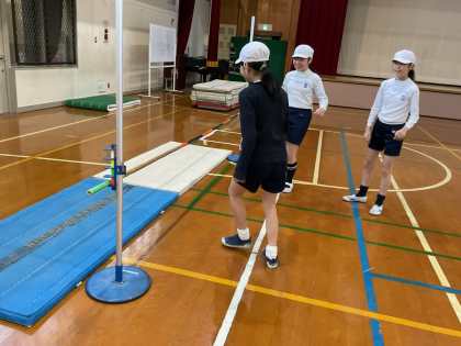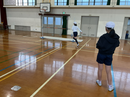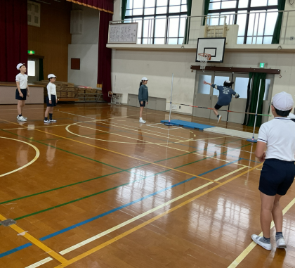 体育では「走り高跳び」をしています。毎時間自分の目標を決め、それに向かって努力しています。友達からアドバイスをもらったり、エアで跳んでみたり、ゴムで跳んでみたり…。いろいろ工夫して練習しています。