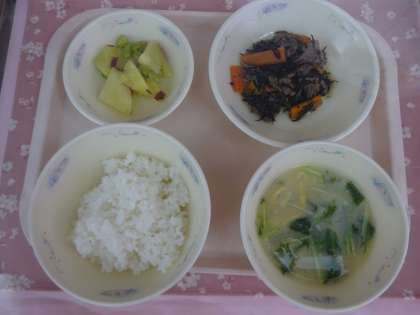 今日の給食は、ごはん・牛乳・牛肉とひじきのいため煮・さつまいもの栂尾煮・水菜のみそ汁でした。
