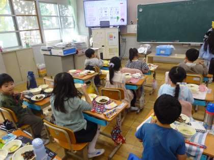 栂尾煮は、さつまいもを砂糖で煮た料理で、京都市右京区の「栂尾」という地域にある高山寺で生まれました。高山寺という名前を聞いて、6年生は「鳥獣戯画がある所だ!」と国語の学習を思い出していました。今日は、さつまいもと枝豆を一緒にスチームコンベクションオーブンで調理しました。甘くて美味しいです。