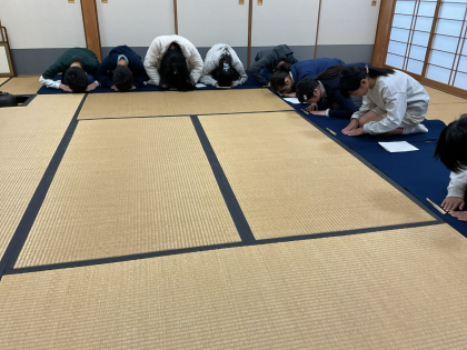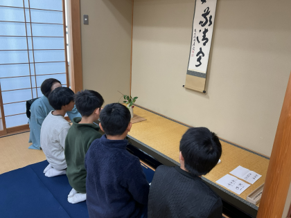 茶道体験をしました。地域のお茶の先生方にゲストティーチャーとして来ていただきました。先生方の指導で作法や所作を学び、礼儀正しくご挨拶をするところから始まりました。正座をして先生方の話を聞くことができました。