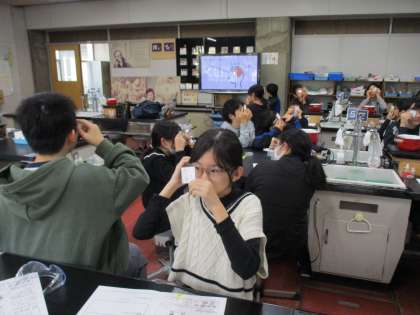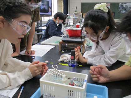 白いビーズに紫外線を当てると、なんと色んな色に変化しました。新しい、紫外線のひみつの発見です!青い糊も、紫外線が色が変わる?!