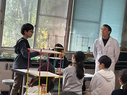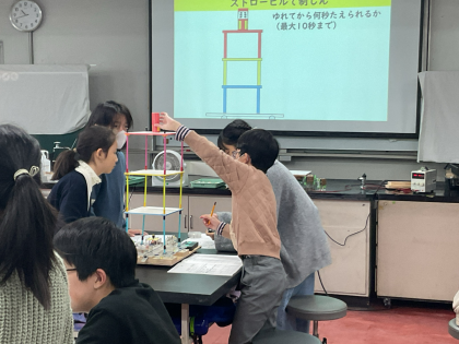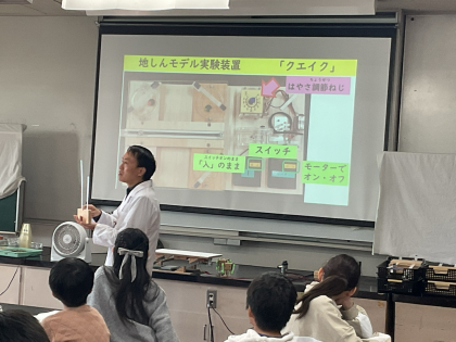 「クエイク」という地震モデル実験装置を使って、地震の被害を防ぐためにはどうすればよいか考えました。