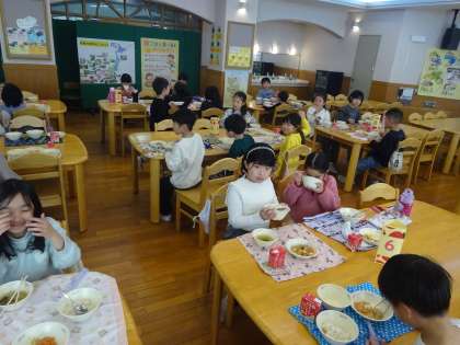 今日は2年1組がランチルーム給食でした。ジャーツァントウフが大人気でした。楽しく食べられましたね。