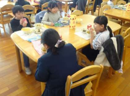今日は、1年3組がランチルーム給食でした。前の日からとっても楽しみにしていました。ランチルームで食べるといつもより美味しく感じたという子もいました。会食の良さを感じられたようでした。おかわりもたくさんできて、満足気でした。