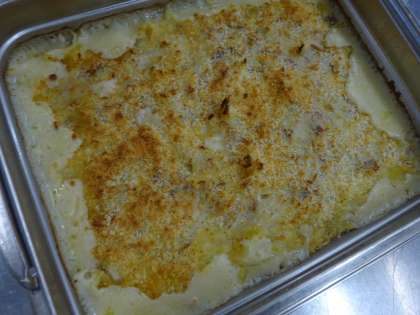 ペンネの豆乳グラタンは、手作りのルーがまろやかです。表面がカリッとなるように、スチームコンベクションオーブンで焼き目をつけています。豆乳のやさしい甘さも好評でした。