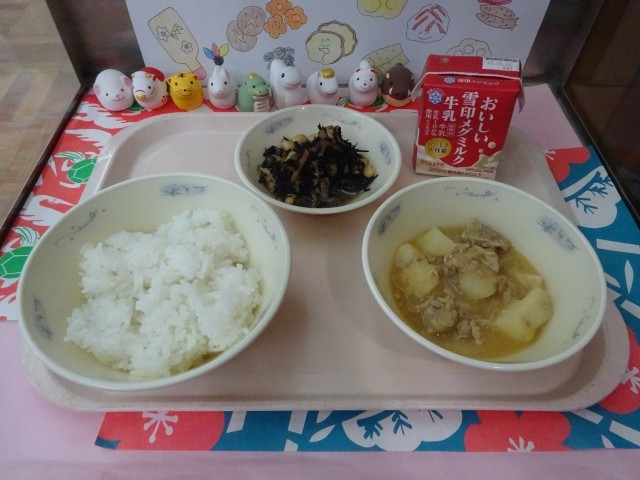1月13日(火)の給食は、ごはん・牛乳・肉じゃが(ピリカラみそ味)・ひじき豆でした。