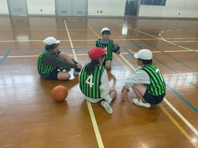 立てた作戦がなかなかうまくいかなくても、チームで声を掛け合って頑張っています。1Qが終わるたび、作戦を確認しています。パスがどんどんつながるようになってきています。
