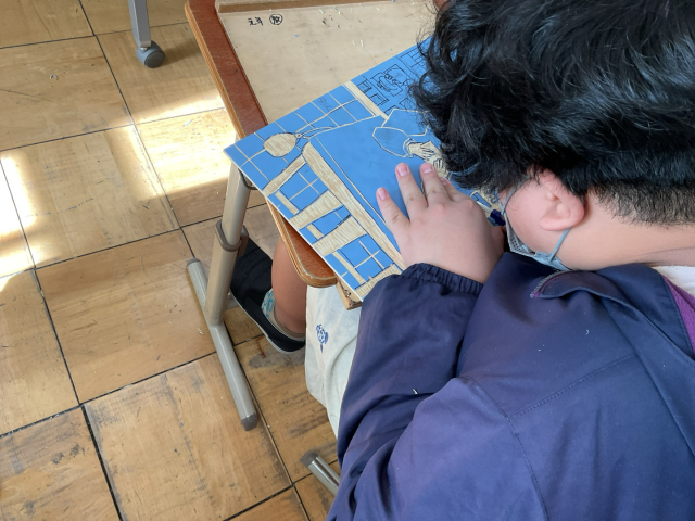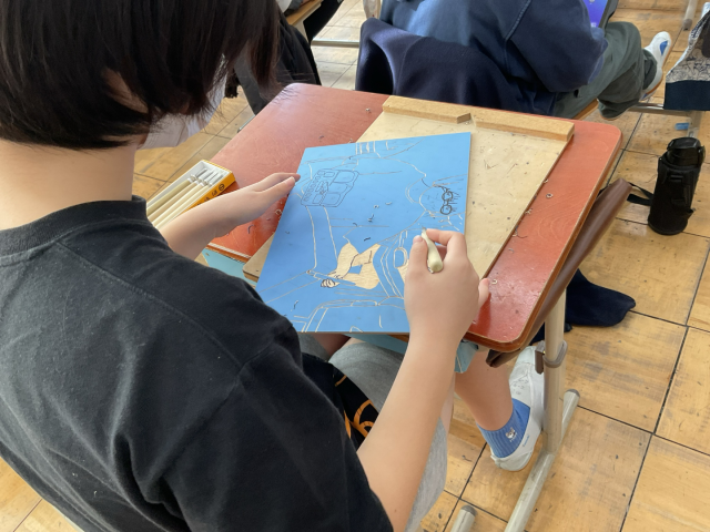 図工では「版画」をしています。小学校の思い出をテーマに、自分の好きな場所や好きな場面などを表現しています。彫刻刀を使って彫っています。もうすぐ「刷り」をします。