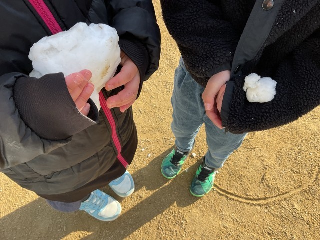 1年 生活「ふゆとともだち」 公開日 2026/01/22 更新日 2026/01/22 1年生のページ 運動場に雪が少し残っていたので、雪を触って丸めたり、霜柱を探したりしました。また、冬は夏に比べると影が長くなります。影ふみあそびをして、冬のあそびを楽しみました。