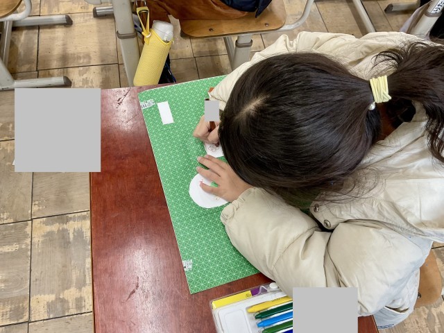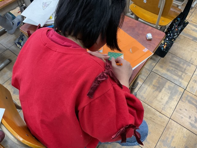 今日の学習では、カッターナイフで開けた窓の中に、窓から出てきてほしいものを考え、絵を描いていきました。好きな果物や動物などを描いて、みんなのそれぞれの世界が出来上がってきています。