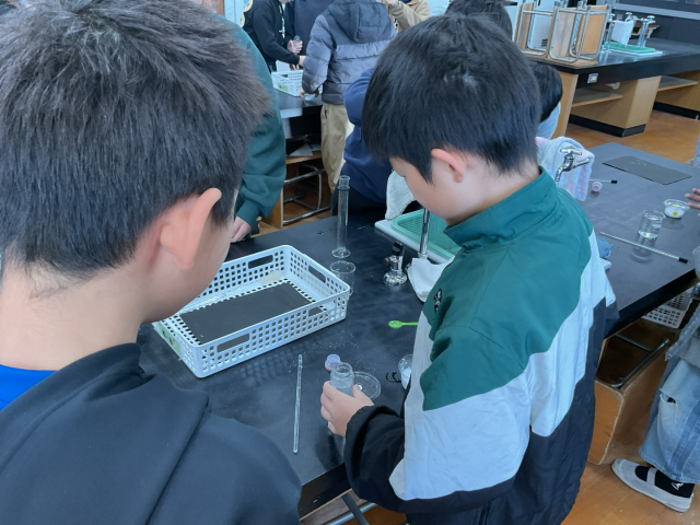 5年生 理科~もののとけかた~ 公開日 2026/01/30 更新日 2026/01/30 5年生のページ 食塩やミョウバンが水にどれくらい溶けるのか、実験を通して学びました。みんなで協力しながら手際よく実験を進めています。