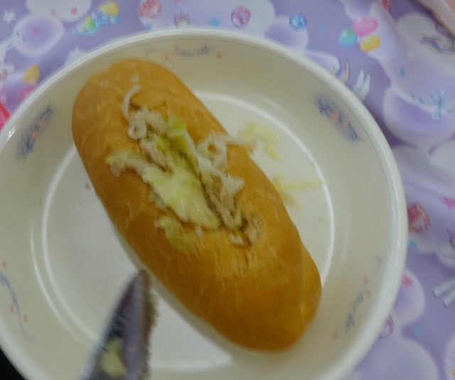 今日の給食は、コッペパン・牛乳・ツナサンドの具(フレンチ味)・白いんげん豆のチャウダーでした。ツナサンドの具をパンに挟んで食べます。1年生もスプーンを使って上手にサンドすることができました。
