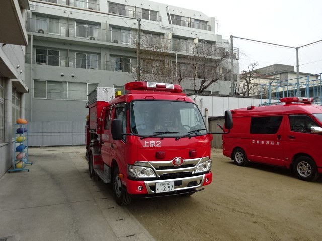 上京消防署からもたくさんの所員さんに来ていただき、子どもも教職員も一緒に訓練を行いました。