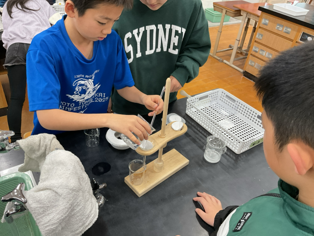 水に溶けた食塩を取り出す実験をしました。ろ過を行うことで食塩を取り出すことができました。