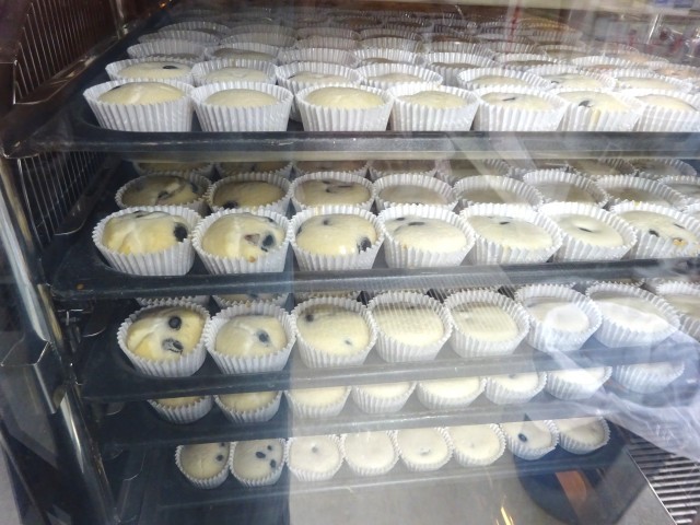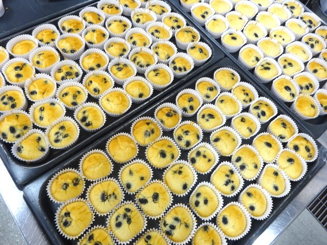新献立のみやこ焼きは、米粉を使った手作りのデザートです。米粉・ベーキングパウダー・三温糖・水・しょうゆ・サラダ油をなめらかになるまで混ぜます。一つずつカップに入れ、黒豆をのせて、スチームコンベクションオーブンで焼きました。心をこめて調理員さんが作りました。