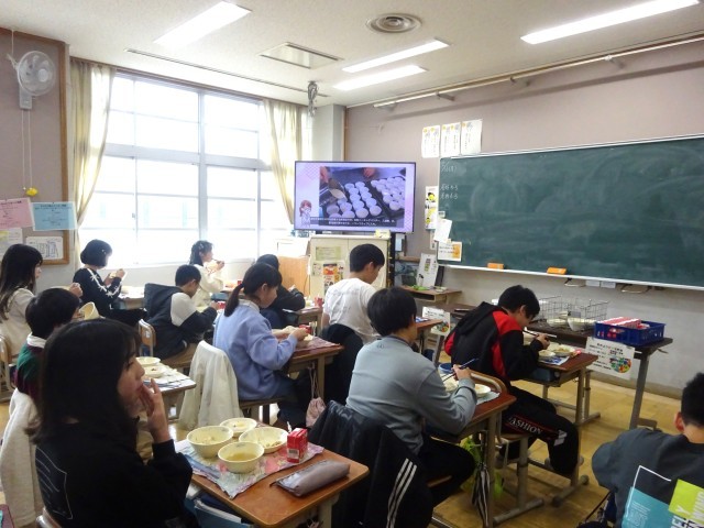 今日の給食は、麦ごはん・牛乳・とりとすぐきの混ぜごはん(具)・豚汁・みやこ焼き(黒豆)でした。