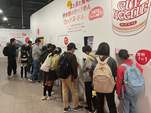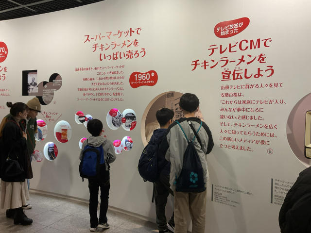 カップヌードルの歴史が展示されていました。「これがおいしい!」と興味津々に見ていました。
