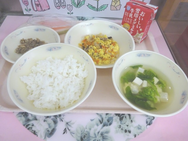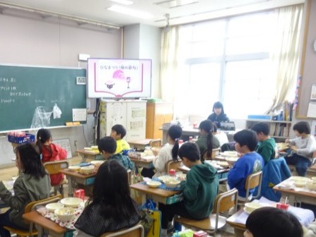 1日早いですが、ひなまつりの献立でした。3月3日のひなまつりは、子どもたちの成長や健康を願う行事です。給食では、ちらしずしを食べてお祝いします。「家でもちらしずしを食べたよ!」「ひなまつりの献立だね」と子どもたちは言っていました。