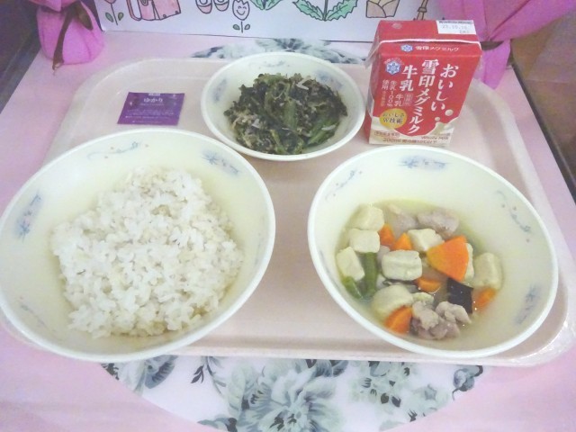 今日の給食は、麦ごはん・牛乳・高野どうふと野菜の炊き合わせ・ほうれん草ともやしのごま煮・ふりかけ(しそ)でした。高野どうふと野菜の炊き合わせは、高野どうふにお出汁がよくしみていました。