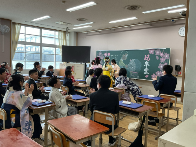 卒業式後、クラスで最後のお別れをしました。中学校でも自分らしさを忘れずにがんばってください。
