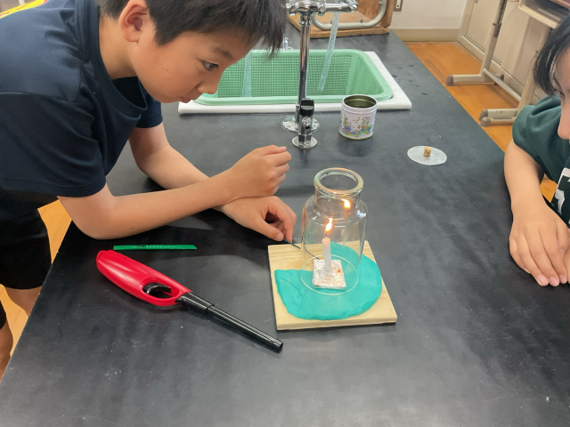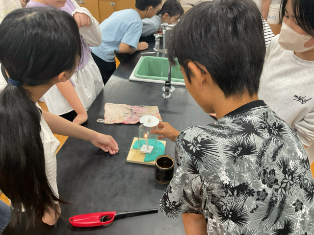 理科の学習で実験をしました。物が燃えるのに空気が必要かどうかを調べました。みんな安全を確認しながら取り組みました。