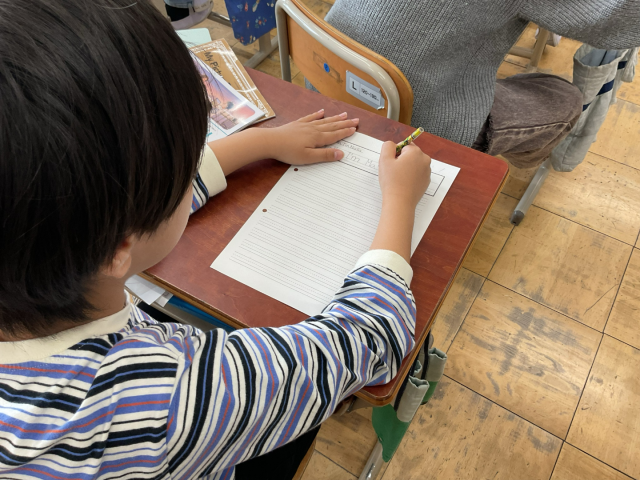 英語で文章を書く練習をしました。大文字や小文字を使いながら文を書きました。