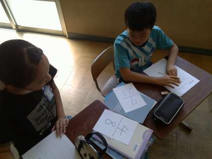 みんなが条件の範囲内で書いた分数を手に,大きさ比べをします。数が大きすぎて通分に時間がかかるときもありましたが,相手と一緒に通分をして確認をして,最後には最強分数を見付けました。