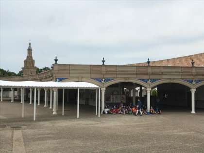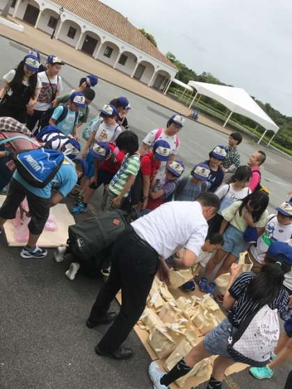 伊勢でのすべての活動を終え,お土産を受け取っています。この後,バスに乗って学校へ向かいます。