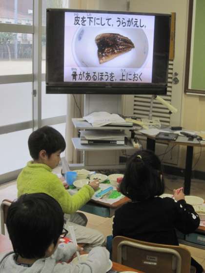 1年生は,「先生。ブリッジしているので,できません」など,魚の骨をとるのに苦労している子がたくさんいました。