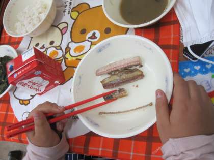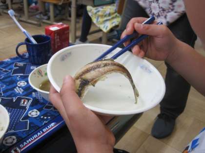 5年生の教室に行くと,上手に骨をとって食べている子がいました。きれいですね。
