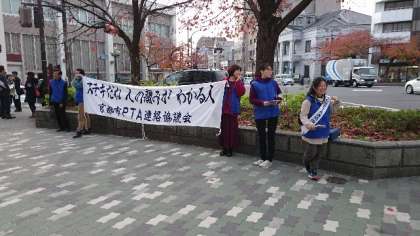 1日には、京都市PTA連絡協議会主催の「人権尊重街頭啓発」に本校も参加し,カイロを配ってきました。