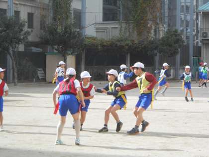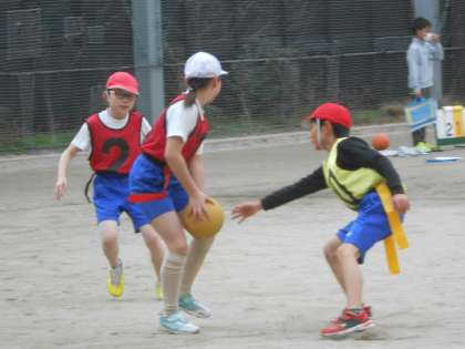 4年生が体育の学習で,タグラグビーに取り組んでいました。ルールにもずいぶん慣れて,パスをつないだり,タグを取ったり,地面にボールを置いてトライに挑戦したり。楽しく活動していました。