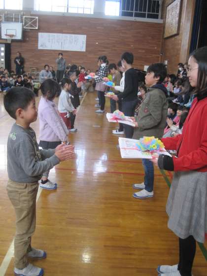 5年生を中心に1〜5年生で作ったプレゼントも6年生に渡しました。
